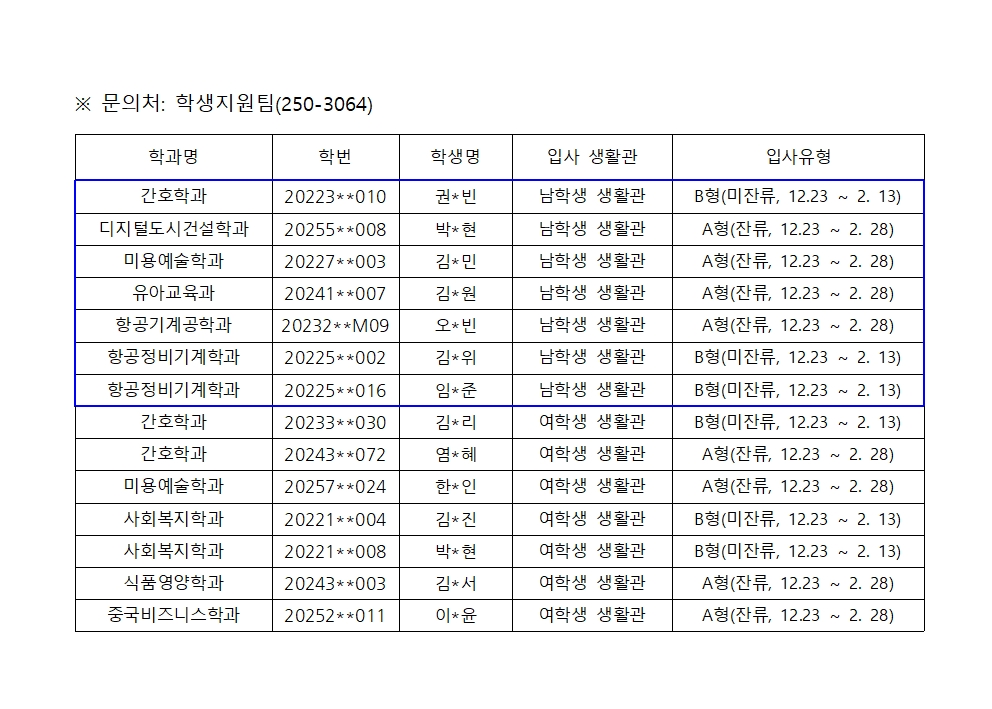 2025학년도 동계방학 2차 입사자 명단(남,여 생활관)