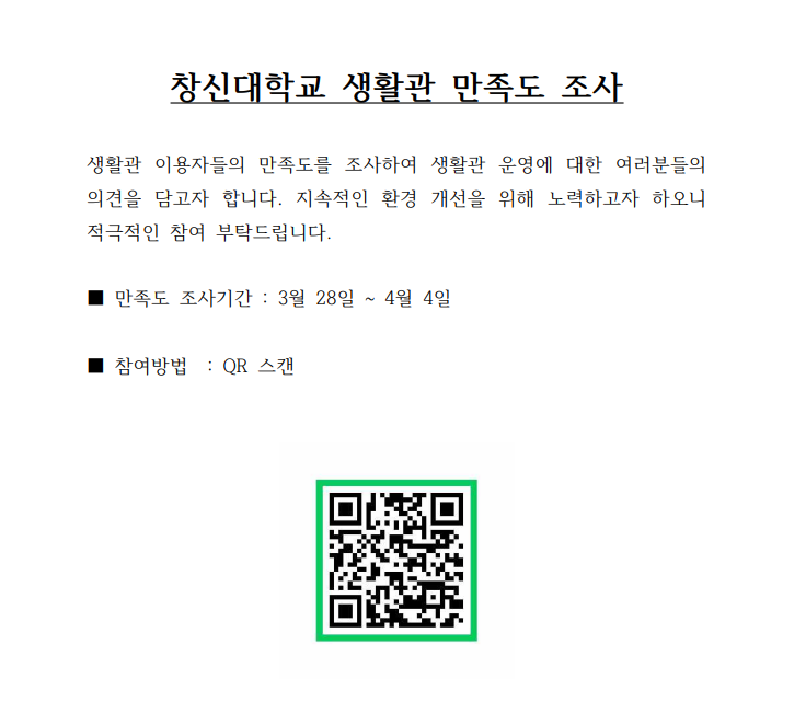 학생생활관 환경개선을 위한 학생들의 의견을 받고자 생활관 만족도 설문조사를 실시하고자 합니다.